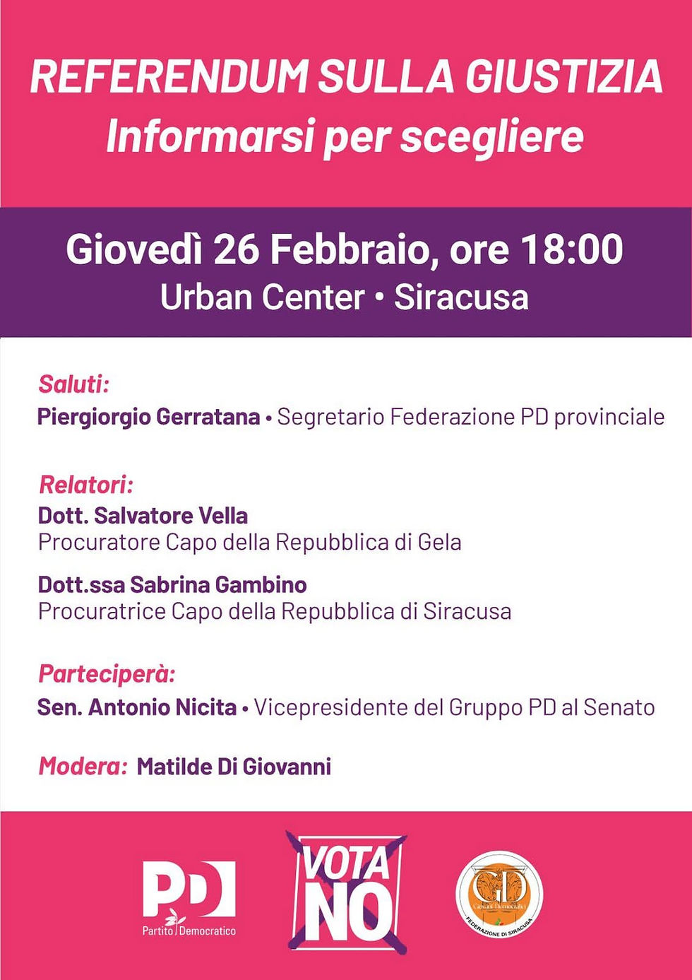 La Federazione Provinciale del Partito Democratico di Siracusa promuove un momento pubblico di approfondimento e confronto sui temi del referendum sulla giustizia.